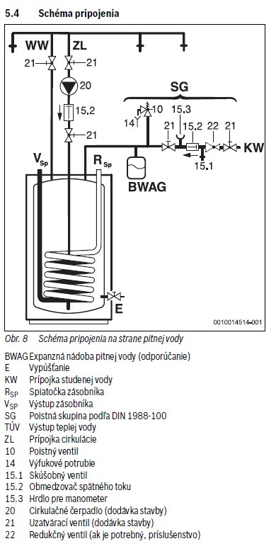 - SG: Poistná skupina (skúšobný ventil, obmedzovač spätného toku, hrdlo pre manometer)