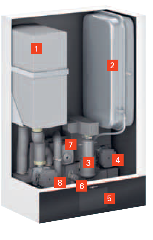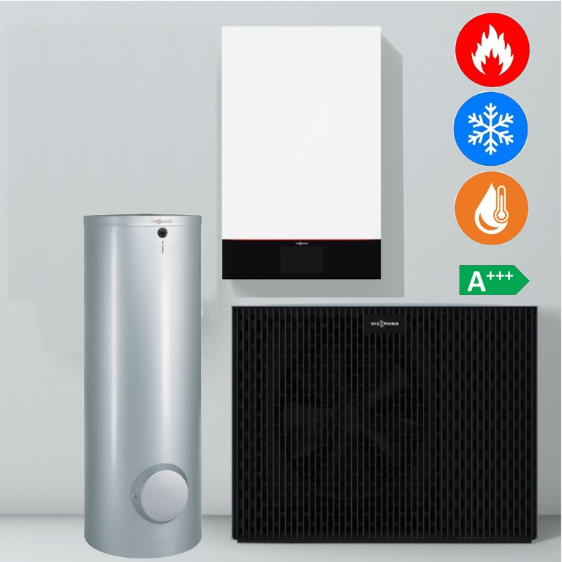 Pozostáva z vnútornej jednotky, vonkajšej jednotky 400 V, zásobníka TÚV Vitocell 100-W typ CVBC 300 litrov, snímača vonkajšej teploty, snímača teploty zásobníka TÚV, expanznej nádoby na vykurovaciu vodu, sady guľových kohútov.